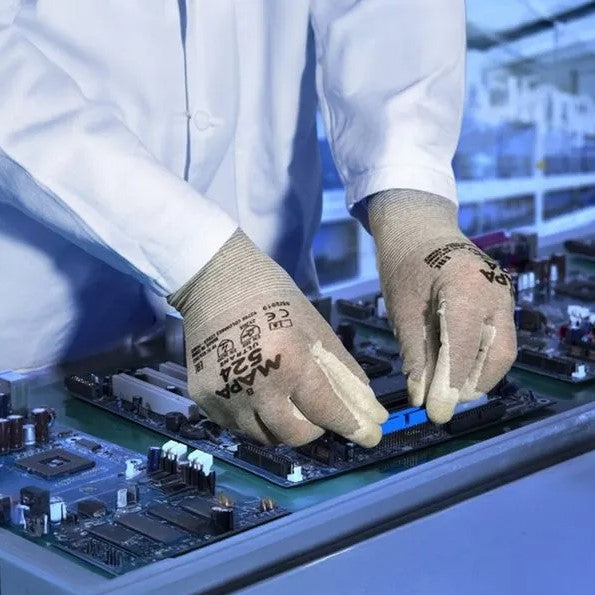 Diseñado para prevenir descargas de electricidad estática. Con resistividad de superficie entre 10E+06 ohmios y 10E+08 ohmios. Su Revestimiento tejido sin costuras asegura comodidad y limpieza. Forro de Nylon, Poliéster y poliuretano.